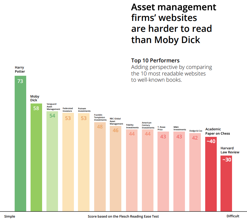 The higher the score on the test, the easier the content is to understand. For example, plain English (easily understood by 13-15 year olds) is graded at 60. Harry Potter is 73 and Moby Dick is 58. The average finance website, however, is 37 - not far ahead of the hefty Harvard Law Review at 30.